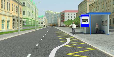 «Желтую ломаную» линию разметки очень сложно перепутать с какой-либо иной. Кстати, протяженность разметки 1.17 определяется интенсивностью движения маршрутных транспортных средств и легковых такси по данному участку дороги: чем интенсивнее движение, тем больше места необходимо для осуществления их остановки и стоянки и, следовательно, тем протяженнее разметка.